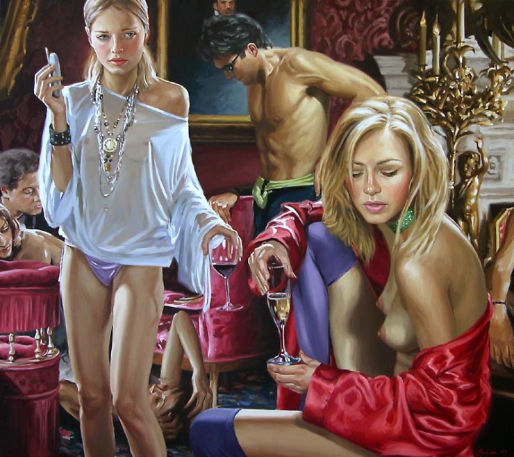 Всемирно известный американский художник Терри Роджерс изобразивший в своих многочисленных работах "Золотую молодежь" Америки. Глядя на эти картины, лично у меня, создаётся впечатление, что если бы "Великий Гетсби" был написан совсем недавно, то именно такой была бы обратная, скрытая от посторонних глаз, сторона медали, тех беззаботных и шикарных вечеринок о которых мы читали в вышеуказанной книге. Работы Роджерса можно рассматривать бесконечно, каждый раз обнаруживая всё больше новых деталей и узнавая известных личностей и celebrity в лицах их персонажей.
